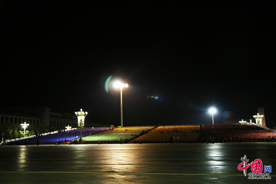 9月3日凌晨,天安門廣場的二中閱兵區域進入最后的倒計時準備階段。圖為準備迎接來賓的觀禮臺。中國網記者 鄭亮 攝