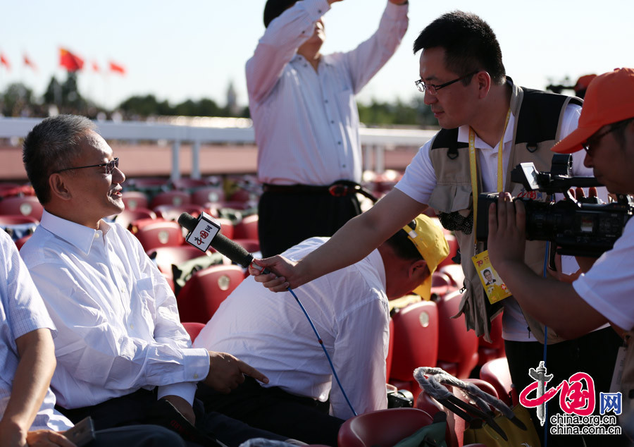 9月3日,中國人民抗日戰爭暨世界反法西斯戰爭勝利70周年紀念大會將在北京隆重舉行。圖為中國網記者齊凱在活動現場采訪。中國網記者 鄭亮攝影