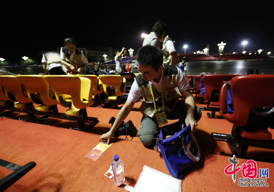 9月3日,中國人民抗日戰爭暨世界反法西斯戰爭勝利70周年紀念大會將在北京隆重舉行。圖為中國網記陳維崧在整理現場發放的物品袋。中國網記者 楊佳攝影