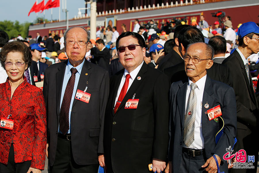 9月3日,中國人民抗日戰爭暨世界反法西斯戰爭勝利70周年紀念大會即將開始,嘉賓陸續到達。圖為嘉賓進行合影。中國網記者 楊佳 攝