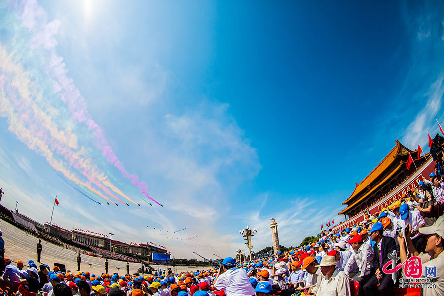 9月3日,中國人民抗日戰爭暨世界反法西斯戰爭勝利70周年紀念大會在北京隆重舉行。這是直升機梯隊接受檢閱。中國網記者 鄭亮 攝