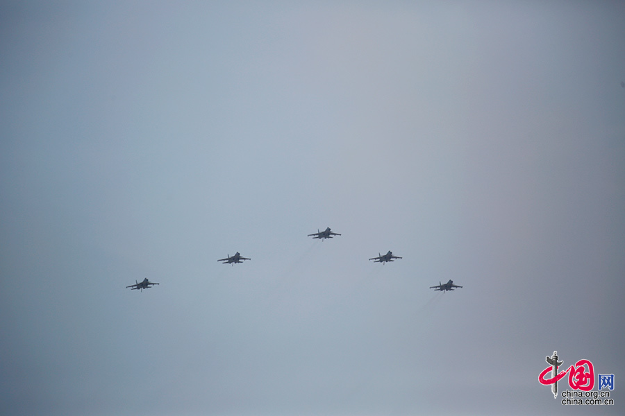 9月3日,中國人民抗日戰(zhàn)爭暨世界反法西斯戰(zhàn)爭勝利70周年紀(jì)念大會(huì)在北京隆重舉行。圖為艦載機(jī)梯隊(duì)接受檢閱。中國網(wǎng)記者 楊佳 攝