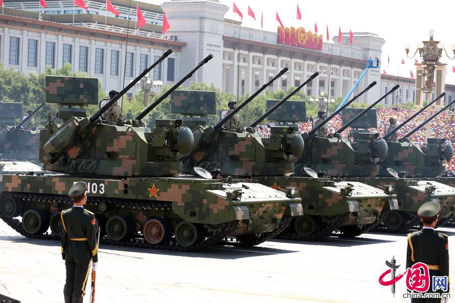9月3日,中國人民抗日戰爭暨世界反法西斯戰爭勝利70周年紀念大會在北京隆重舉行。這是高射炮兵方隊接受檢閱。