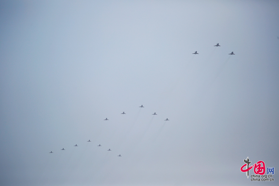 9月3日,中國人民抗日戰爭暨世界反法西斯戰爭勝利70周年紀念大會在北京隆重舉行。圖為殲擊機第二梯隊接受檢閱。中國網記者 楊佳 攝