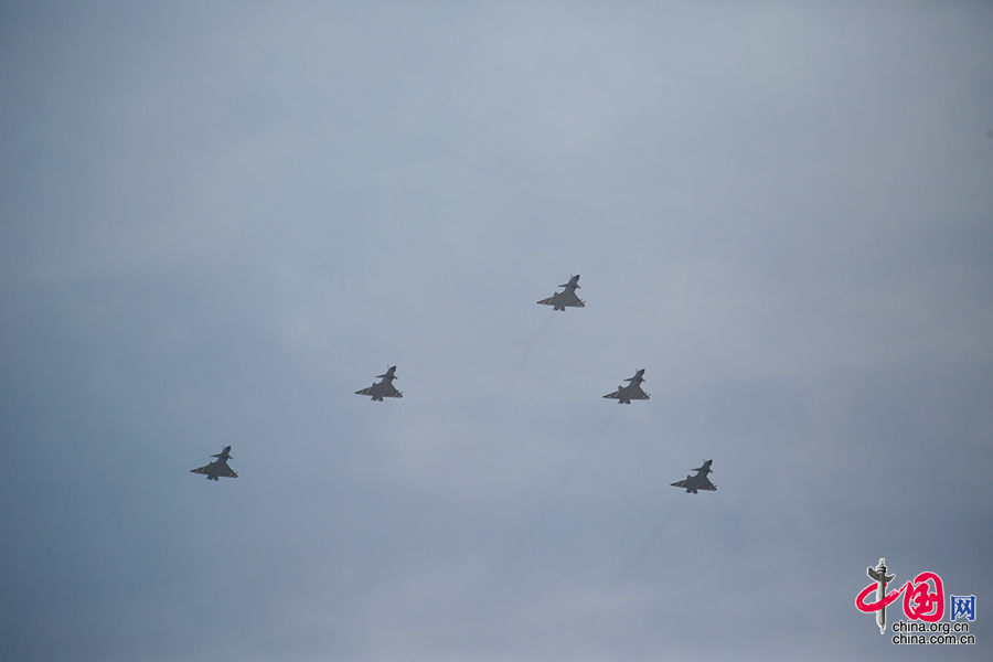 9月3日,中國人民抗日戰爭暨世界反法西斯戰爭勝利70周年紀念大會在北京隆重舉行。圖為殲擊機第二梯隊接受檢閱。中國網記者 楊佳 攝