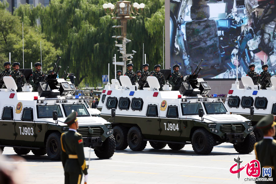 9月3日,中國人民抗日戰爭暨世界反法西斯戰爭勝利70周年紀念大會在北京隆重舉行。武警反恐突擊車方隊接受檢閱。