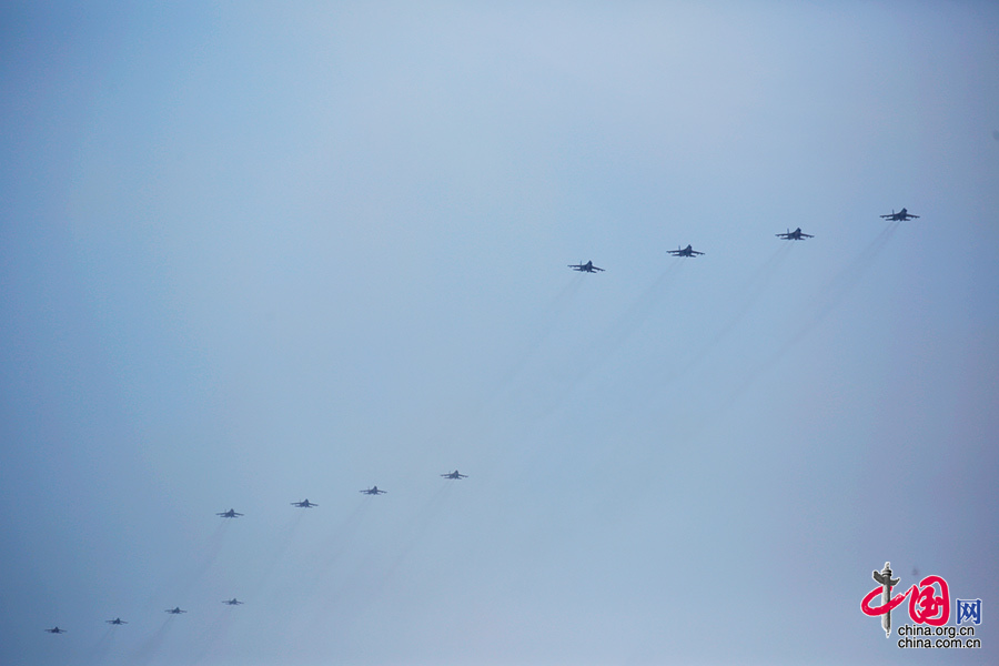 9月3日,中國人民抗日戰爭暨世界反法西斯戰爭勝利70周年紀念大會在北京隆重舉行。圖為殲擊機第一梯隊接受檢閱。中國網記者 楊佳 攝