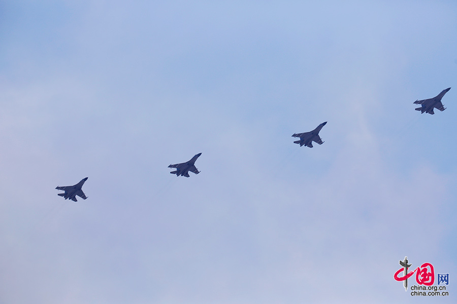 9月3日,中國人民抗日戰爭暨世界反法西斯戰爭勝利70周年紀念大會在北京隆重舉行。圖為殲擊機第一梯隊接受檢閱。中國網記者 楊佳 攝