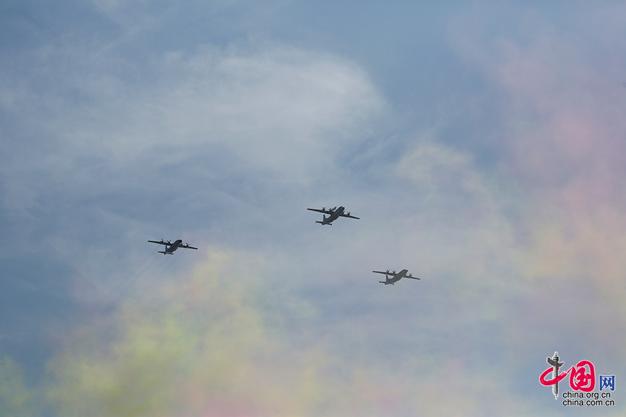 9月3日,中國人民抗日戰爭暨世界反法西斯戰爭勝利70周年紀念大會在北京隆重舉行。圖為海上巡邏機梯隊接受檢閱。中國網記者 楊佳 攝
